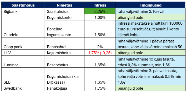 Eesti pankade poolt pakutavate säästuhoiuste turul on jaanuaris toimunud üks muutus – LHV vähendas 0,25 protsendipunkti võrra eraisikute säästuhoiustele pakutavat intressimäära, samas kui teistes pankades intressimäärad ei muutunud. Turu parim pakkumine on endiselt Bigbanki pakutav 2,25% aasta baasil ning vahe parima ja halvima intressimäära vahel on ikka koguni 1,25 protsendipunkti.
