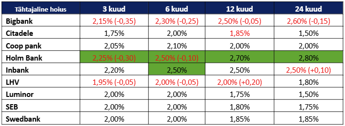 Hetkeseisuga on kolmekuuliste tähtajaliste pangahoiuste osas turu parim intressipakkumine 2,25% Holm Pangalt, järgneb Inbank 2,20% ja Bigbank 2,15% protsendiga. Kuuekuuliste hoiuste osas on parimad pakkumised 2,5% Holm Pangalt ja Inbankilt ning 2,30% Bigbankilt. Aastase hoiuse lõikes on hetkel kõrgeim pakutav intress 2,7% Holm Bankilt, millele järgnevad Bigbanki ja Inbanki 2,5%. Kaheaastase hoiuse osas on parim pakkumine Holm Banki 2,80%, millele järgnevad Bigbanki 2,60% ning Inbanki 2,50%.
