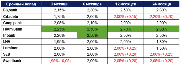 Март 2026 года: процентные ставки по срочным вкладам, предлагаемые коммерческими банками Эстонии частным лицам